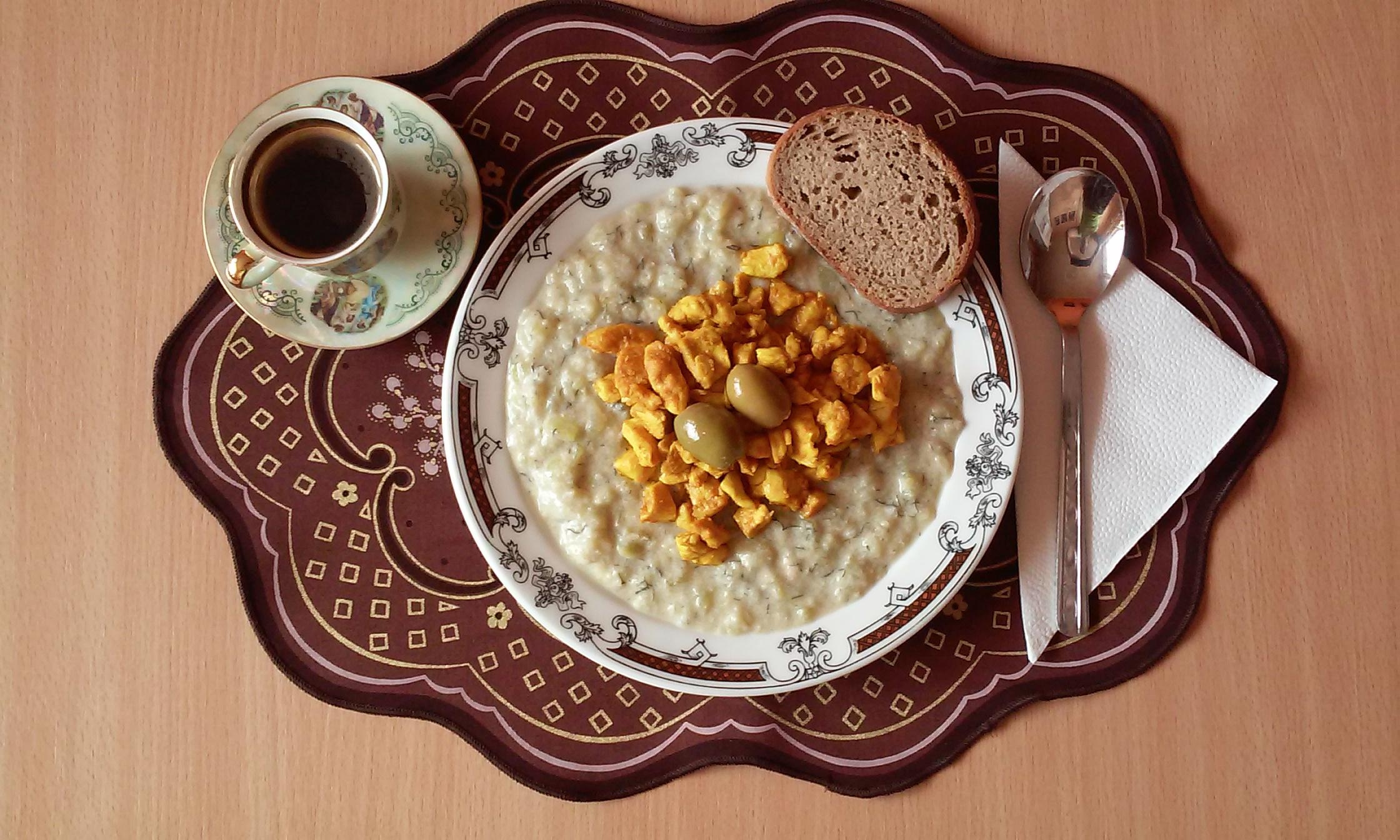 Mäsko - Svoju dávku kuracieho mäska narežete na malé kúsky, orestujete v 2. fáze BEZ oleja nasucho alebo v 2. fáze S olejom na tom našom repkovom /najvhodnejší je zo sklenenej fľaše/. Už orestované mäsko podlejete malým množstvom prevarenej vody, posypete kamennou soľou, mletým čiernym peprom a zdravou mletou kurkumou. Miešate lebo kurkuma sa ľahko prichytí na panvicu.